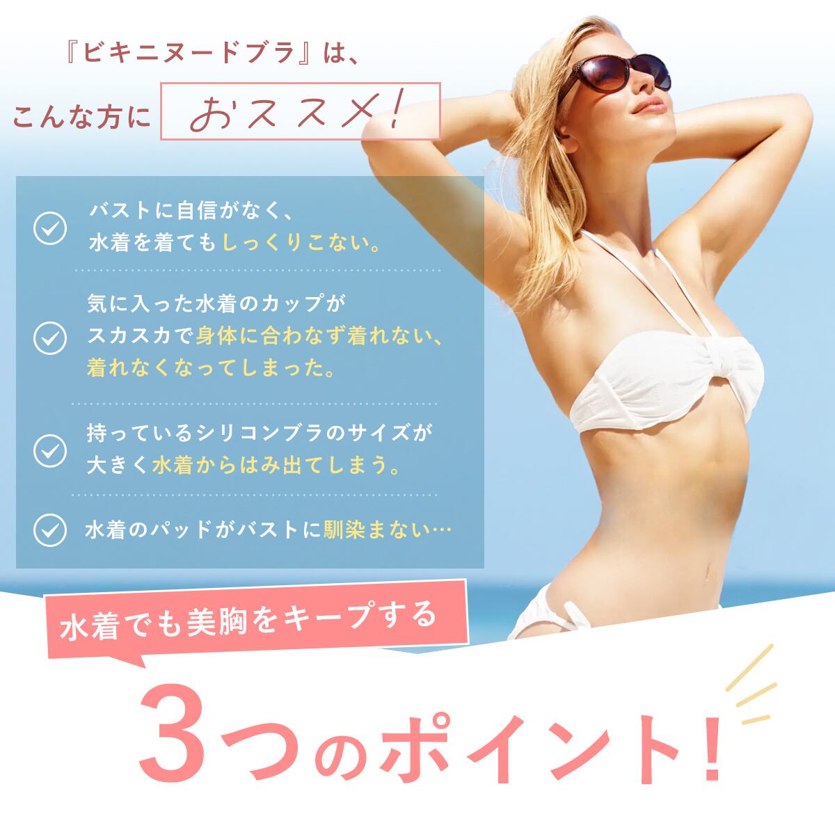 従来のヌーブラでは「サイズが大きくてはみ出す」「ホックが目立つ」などの声が多く、ビキニスタイルには不向きでした。 そこで開発されたのが、**水着やドレスに特化したシリコンブラ「ビキニヌードブラ」**です。